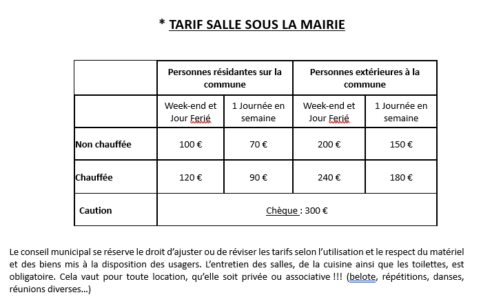 Pour toutes locations, il est obligatoire d'appeler la mairie afin de réserver et de retirer les clés.